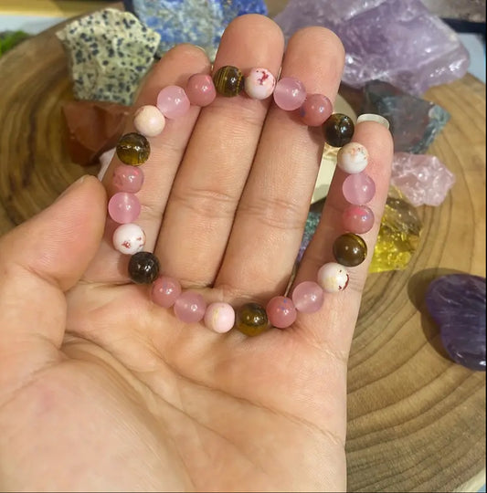Bracelet Amour et Harmonie – Quartz Rose, Rhodochrosite, Jaspe et Œil de Tigre