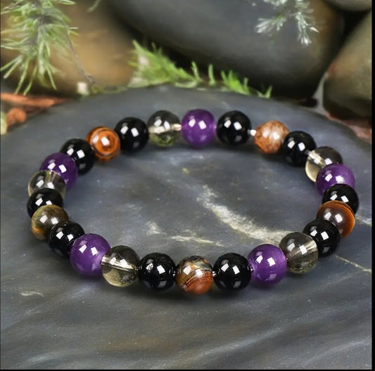 Bracelet en Améthyste, Œil de Tigre, Obsidienne et Quartz Fumé – Intuition & Protection