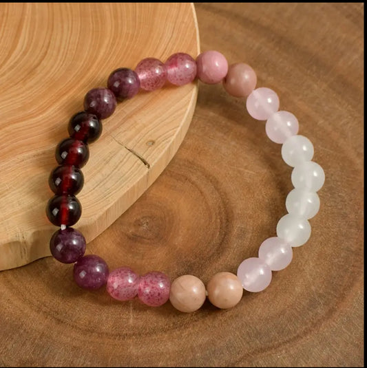 Bracelet en Grenat, Rhodonite, Quartz Fraise et Quartz Rose – Harmonie, Passion et Douceur