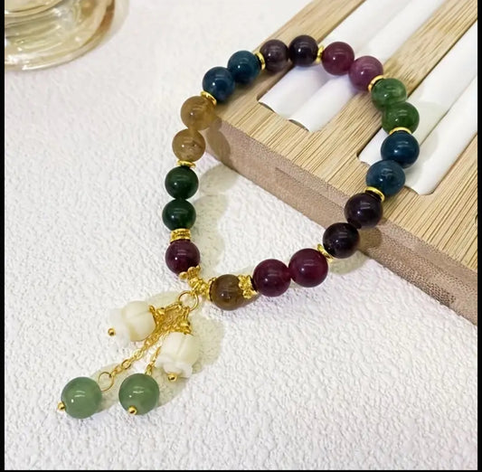 Bracelet en Tourmaline Multicolore avec Pendentif en Jade Sculpté