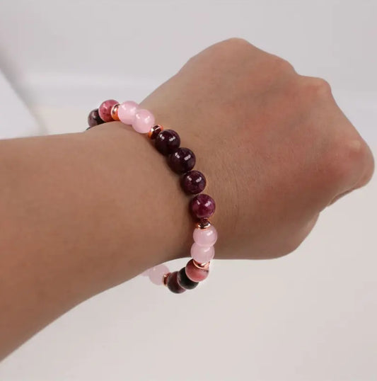 Bracelet en Quartz Rose, Rhodonite, Grenat & Onyx – Amour & Stabilité