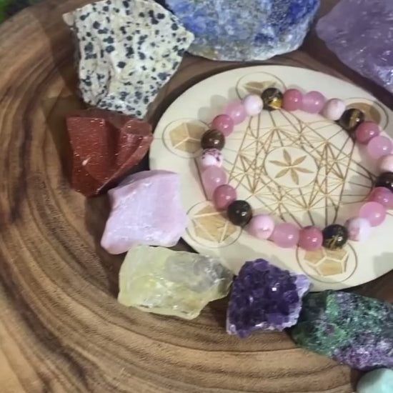 Ce délicat bracelet associe harmonieusement le Quartz Rose, la Rhodonite, et l’Œil de Tigre. Les nuances roses et dorées de ces pierres naturelles évoquent douceur et chaleur. Parfait pour soutenir le cœur, équilibrer les émotions et renforcer l’amour de soi ainsi que la confiance intérieure.