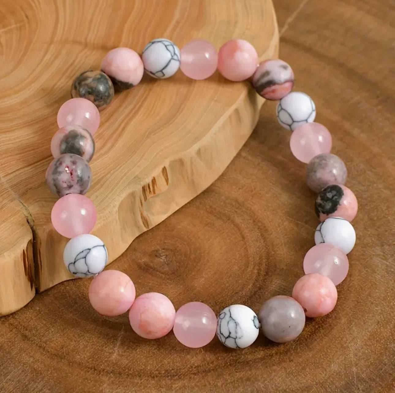 Enveloppez-vous de douceur avec ce bracelet délicat, une alliance harmonieuse de pierres naturelles sélectionnées pour leurs vertus apaisantes. Il associe la tendresse infinie du Quartz Rose, l'élégance marbrée de la Howlite blanche et les nuances de rose et de noir de la Rhodonite. Cette composition, dans une palette de couleurs douces et poudrées, en fait un bijou féminin et réconfortant, un véritable cocon de sérénité à porter au quotidien.