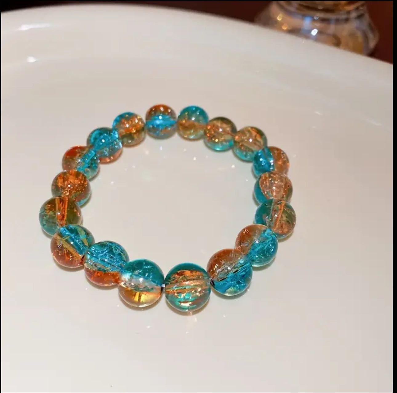 Ce bracelet est composé de perles en quartz craquelé bicolore, aux tons mêlés de bleu turquoise et d’ambre chaud. Son effet craquelé intérieur capte la lumière et donne un aspect à la fois éclatant et unique.