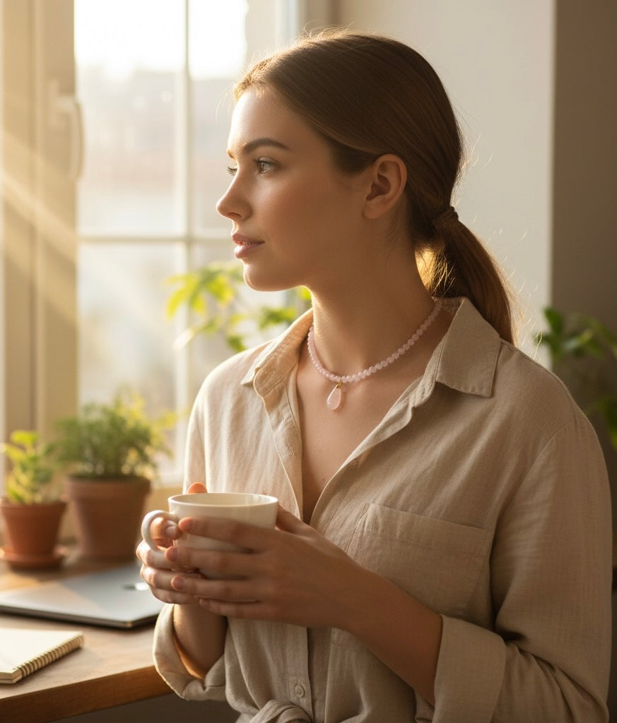 Le collier est orné d'un pendentif goutte en Quartz Rose, ajoutant une touche de grâce. Monté avec un fermoir et une chaînette d'extension dorés, il se porte près du cou comme un "choker". C'est un bijou essentiel pour attirer la tendresse, la paix intérieure et l'amour sous toutes ses formes.