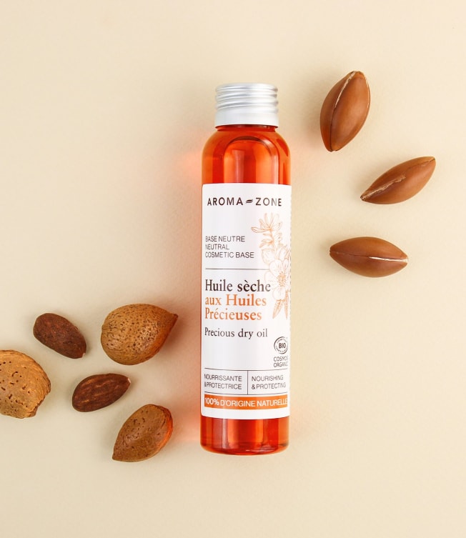 Aux huiles précieuses BIO d'Argan, Rose musquée, Jojoba et Amande douce, cette huile sèche à la texture légère et pénétrante, nourrit, adoucit et protège la peau et les cheveux sans laisser de film gras, ni collant. 100% d'origine naturelle, certifiée BIO et sans allergènes, elle s'adapte à tous les types de peaux. Huile sèche nourrissante corps, huile sèche pailletée, huile sèche protectrice cheveux, huile de soin visage..., elle s'utilise pure ou agrémentée de fragrances, d'huiles essentielles, de nacres et de paillettes pour créer selon ses envies son huile sèche 100% personnalisée.