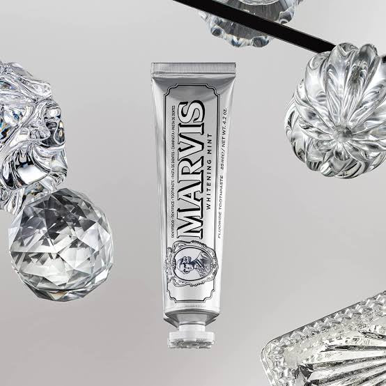 Le goût de menthe fraîche du dentifrice blanchissant Marvis vous offre une sensation de frisson polaire durable.