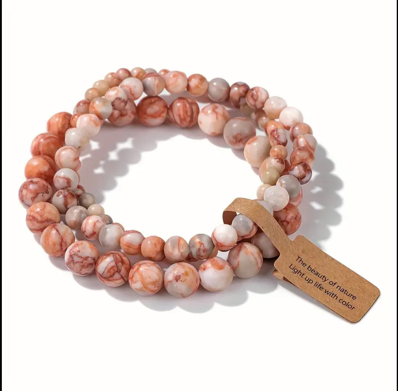 Exprimez votre style avec ce superbe set de trois bracelets en Jaspe. Cet ensemble se compose de trois bracelets indépendants, avec des perles de tailles différentes (par exemple 8mm, 6mm et 4mm), vous permettant de les porter tous ensemble pour un effet de superposition tendance, ou de les associer au gré de vos envies. Chaque perle de Jaspe dévoile un motif unique : un fond blanc crème traversé par un fascinant réseau de veines rouges et orangées, évoquant une toile d'araignée ou les racines de la terre. C'est un bijou au look bohème et authentique, vibrant d'énergie naturelle.